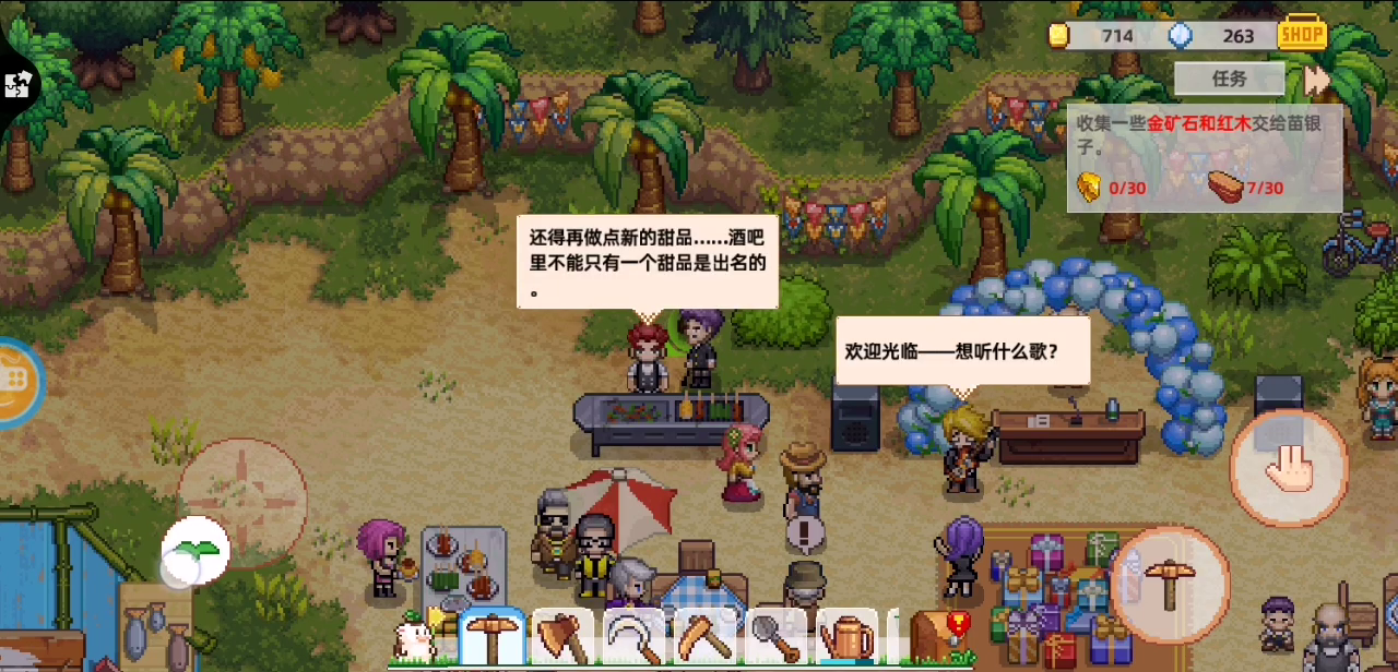 我到沙滩聚会后点击村长开始,没办法放礼物,自己有拿东西的,还特意制作东西,钓鱼,还是不行。一个月才1次啊,我才玩两个月,心累