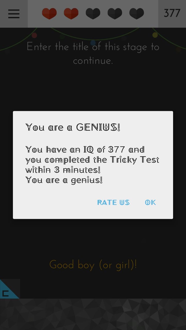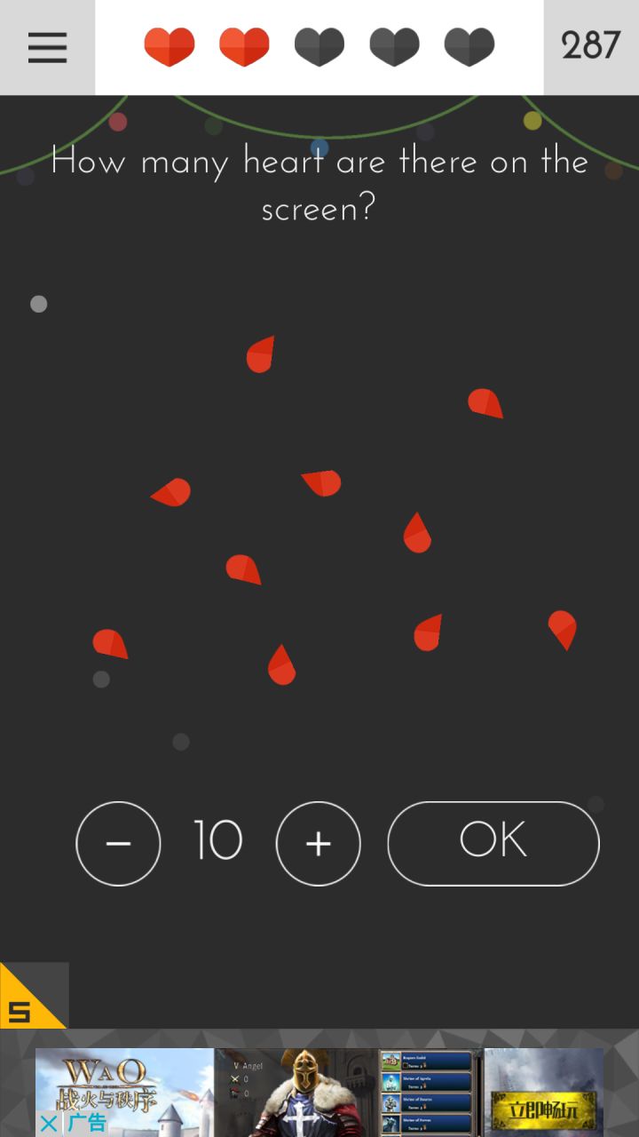 讲道理当我看到从59minXXs变成0minXXs的时候我确实笑了😂然后本来是63min结束战斗变成了3min😂目前来说只有两关用了提示,一个是扎气球那个,确实是没想到啊。还有一个我觉得可能就是bug了,就是多少个心那个,因为包括看提示前我就考虑到算上体力心了,并且也试过只算红心均失败,甚至我开始想会不会是不算下边这些,但是也不行。结果呢,结果最后是在满血打出10才算我通过这就让我很心塞了🌚挺