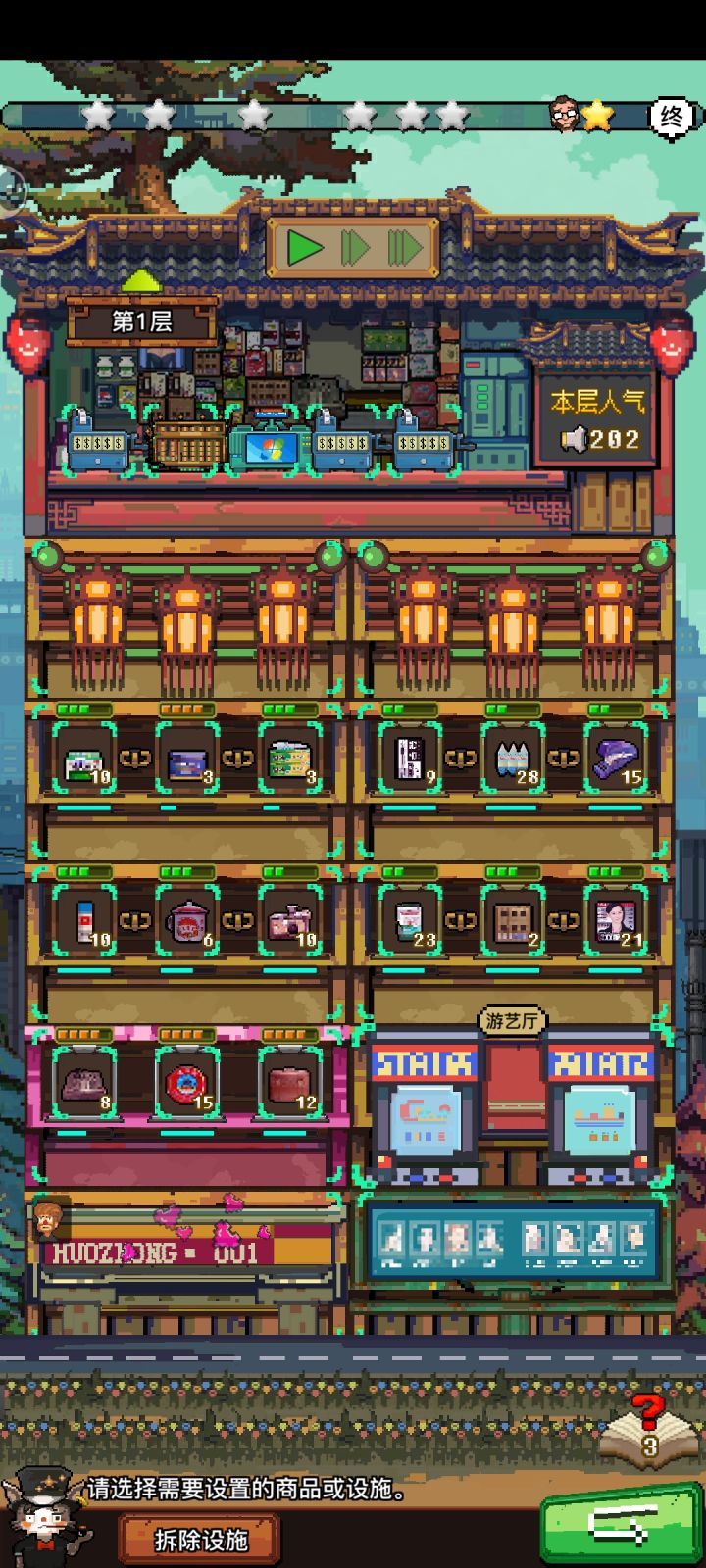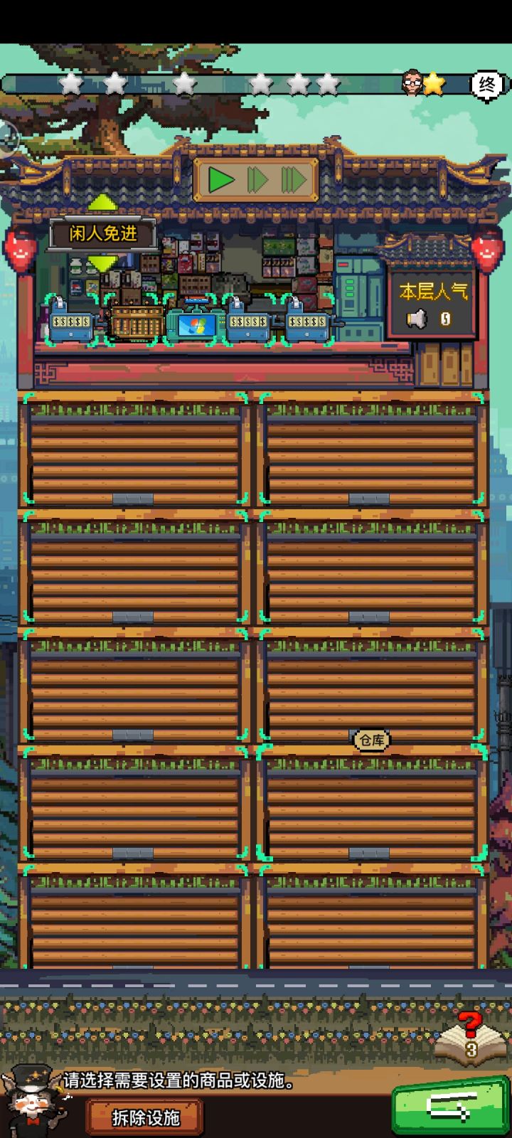 简直就是作弊神器!当你拿下驴牌的代理权,库存拉满!目前最喜欢的楼层配置是:一楼【高档卖场/智能卖场/专卖店】(1-4层只摆一层货,四选一,不然会分流,不信再试试)蔬菜店(人气↑、铜钱↑)+珍宠屋(本层女性设施↑)涂鸦墙(周围人气↑)+艺术廊(人气↑、铜钱↑)娃娃机/ktv(铜钱↑/人气↑)+萌宠屋(周围喜爱度↑)名宠屋(周围售价↑,喜爱度优于喜爱比例)+广告货架a(利润↑上驴牌!)娃