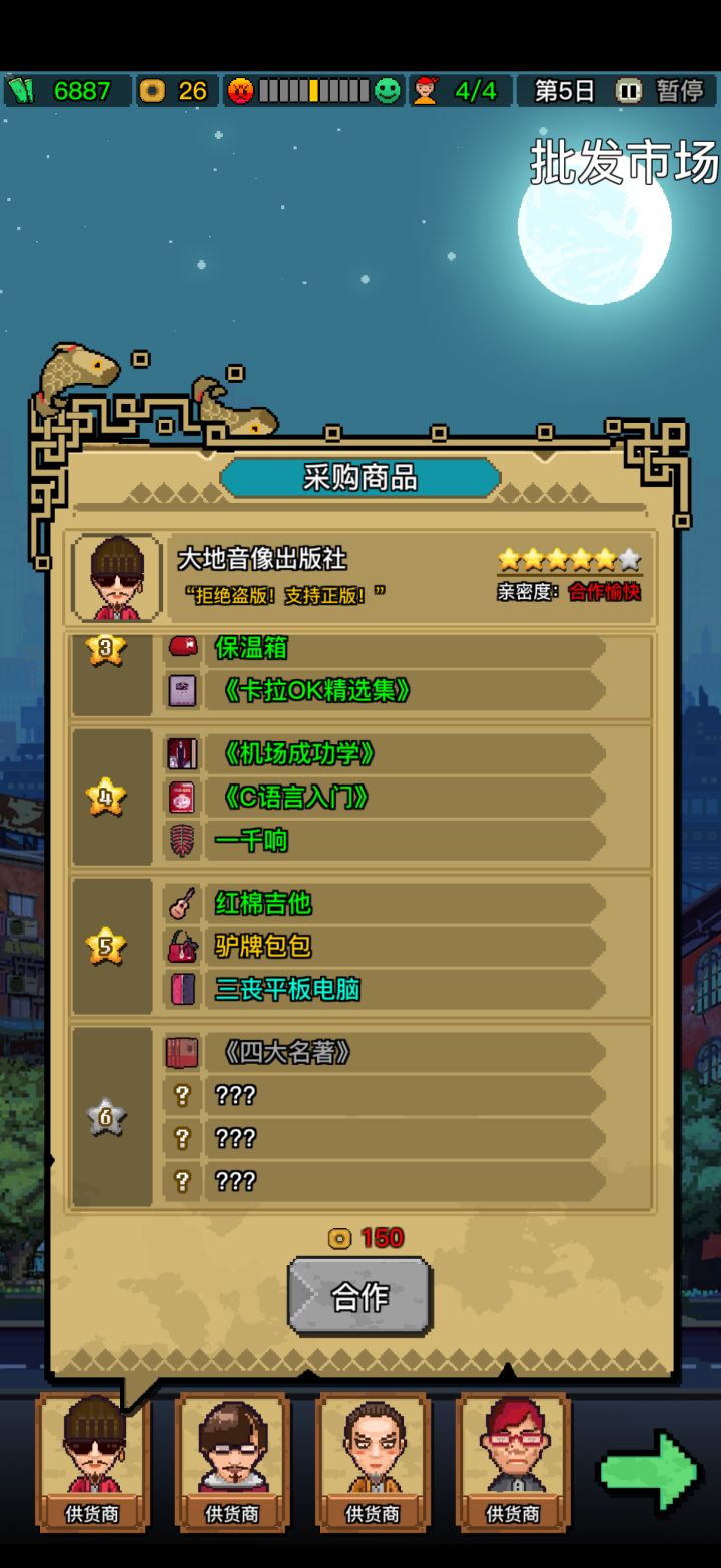 1.第一天人招满,把能开的商品全开然后上架。搞完派1个或者2个人带3000块去铜锣湾,找吊灯,再搞个花盆或者中货架。然后上商品卡。2.后面几天有新商品就把商品卡取了然后再去签约,这样签约还是正常铜币,记住签约完一定要马上把商品卡装回去,取消不算次数。员工薪资直接调到满意。这样做的原因是因为员工薪资满意会加好感度,这样可以抵消一部分顾客的差评。红色员工薪资调到不错或者合适也就够了,不用到满意3.
