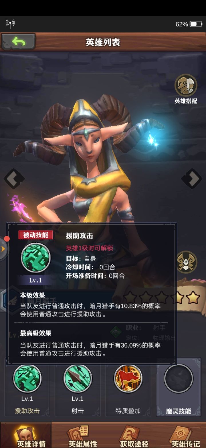搭配英雄暗月,古老树灵,夜鹰搭配思路,夜莺全速度命中施加虚弱状态,古老树精被虚弱状态的对手普通攻击伤害降低22%,其次有56.25%几率普攻攻击反击,来触发暗月是援助注意事项:魔灵配置很重要暗月带正义白羊等高输出魔灵在这里就不解释,看我另一个攻略,古老树灵必须佩戴重角甲虫,普通攻击有35的几率51%治疗兵力,增加11%兵力的盾,夜莺必须佩戴魔灵沉重巨像前4个回合,随机2名英雄有45的几率普