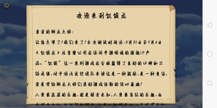 亲爱的驯龙师们大家好:本次“安卓删档测试”将在2018年9月7日00:00结束!大家肯定要问:为什么这么快就结束了?还没有吃饱!没有体验够!没有肝够!大家请放心,我们会尽快让【饥饿龙】正式归来与大家见面,大家当前所看到的游戏内容并不是游戏的最终版本,此次安卓测试期间大家的建议我们都会在后续进行验证测试,梳理出目前可行可支持的建议展现给大家。感谢大家对【饥饿龙】的支持。欢迎大家关注官方公众号