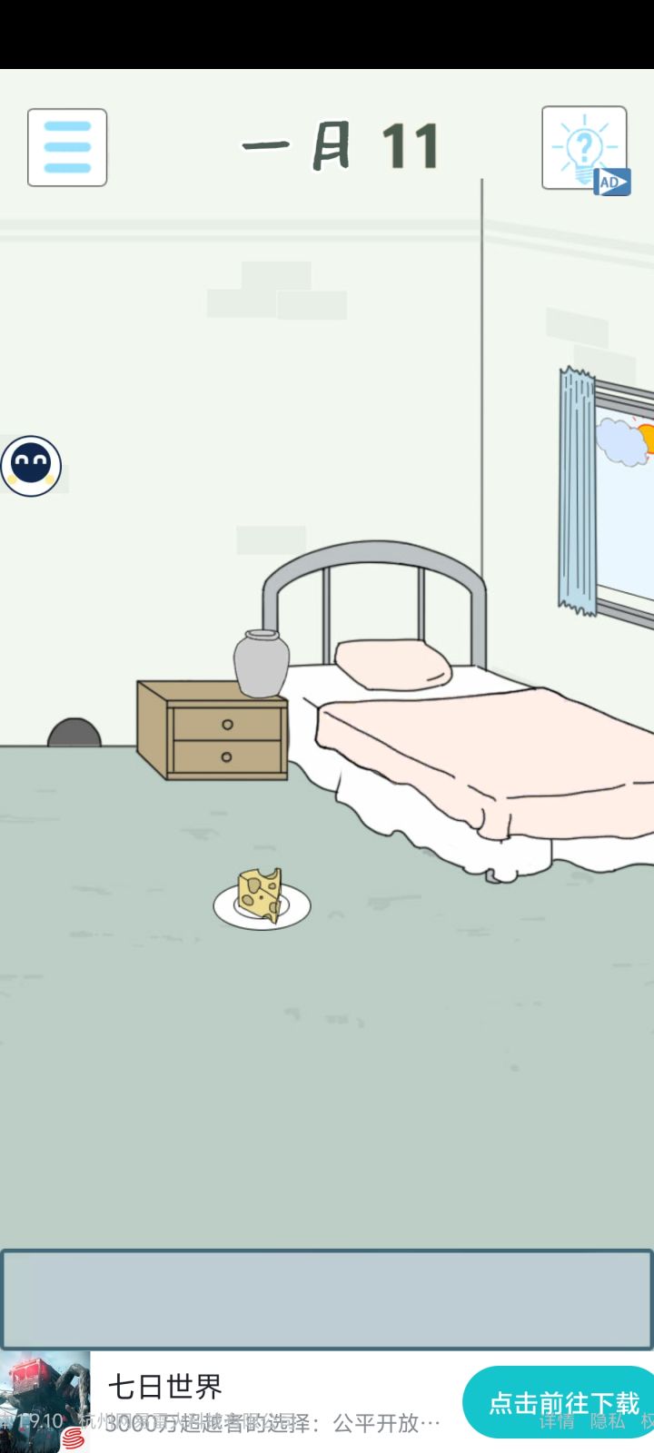 7.到右侧拿到石头和钥匙,再到左侧把石头压在桶上。用钥匙将柜子打开,把被子移开
