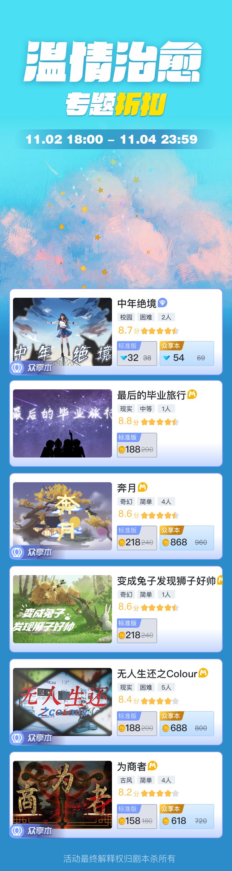 亲爱的侦探们,你们好, 见过了剧本杀里的尔虞我诈, 看多了剧本杀里的悬疑惊悚? 不如来本期的《温情治愈》看看。剧本杀中也有着温暖的怀抱。 家庭的阖家欢乐, 眷侣的浓情蜜意, 挚友的把酒言欢, 在这里,你都能体味。 11/02 18:00—11/04 23:59《温情治愈》剧本专题折扣活动上线啦,包你大呼过瘾! 多人本购买众享本有超大折扣福利!下期你更期待哪些剧本呢?一定要在评论区告诉我们哦~以及你