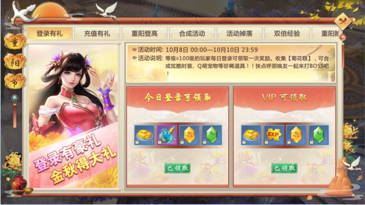 一览高秋天地阔,三杯淡酒醉重阳。步入十月中旬,微凉的清秋已然向我们招手致意,也意味着极具传统文化特色的节日——重阳节的到来!小果也为上仙带来了丰富的节日活动,10月15日至10月17日全面上线,玩法多样、奖励丰富,更有全新坐骑、宠物重阳时装等绝版精美道具等待上仙的领取!活动开启等级:100级【登录有礼】活动时间:10月15日~10月17日活动期间,上仙每天登陆游戏即可领取丰厚奖励,VIP用