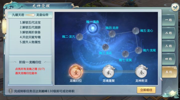 一、 系统新增1、新增职业五转·龙神觉醒等级达到巅峰120级的得道仙友可获得远古龙神青睐,开启五转龙神觉醒任务。经历龙魄归位、龙魂重塑、苍龙觉醒三个阶段即可完成五转。五转材料可通过商城购买及击杀野外小怪获得。觉醒后可解锁12、13阶高阶装备以及开启新天赋类型:专精天赋。2、新增天赋专精上仙完成五转任务后可开启专精天赋,在技能-天赋界面可查看专精页面,满足前置天赋点后,可以激活对应专精天赋