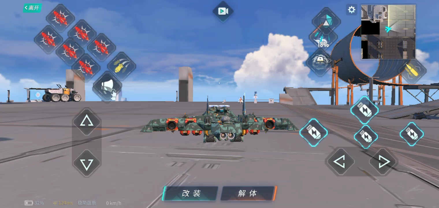 左右转向还是有点不平,应该在前后的中心线上上侧加些方块,我再试一试。 起飞前进侧翻抬低头都基本能在垂直平面内完成。