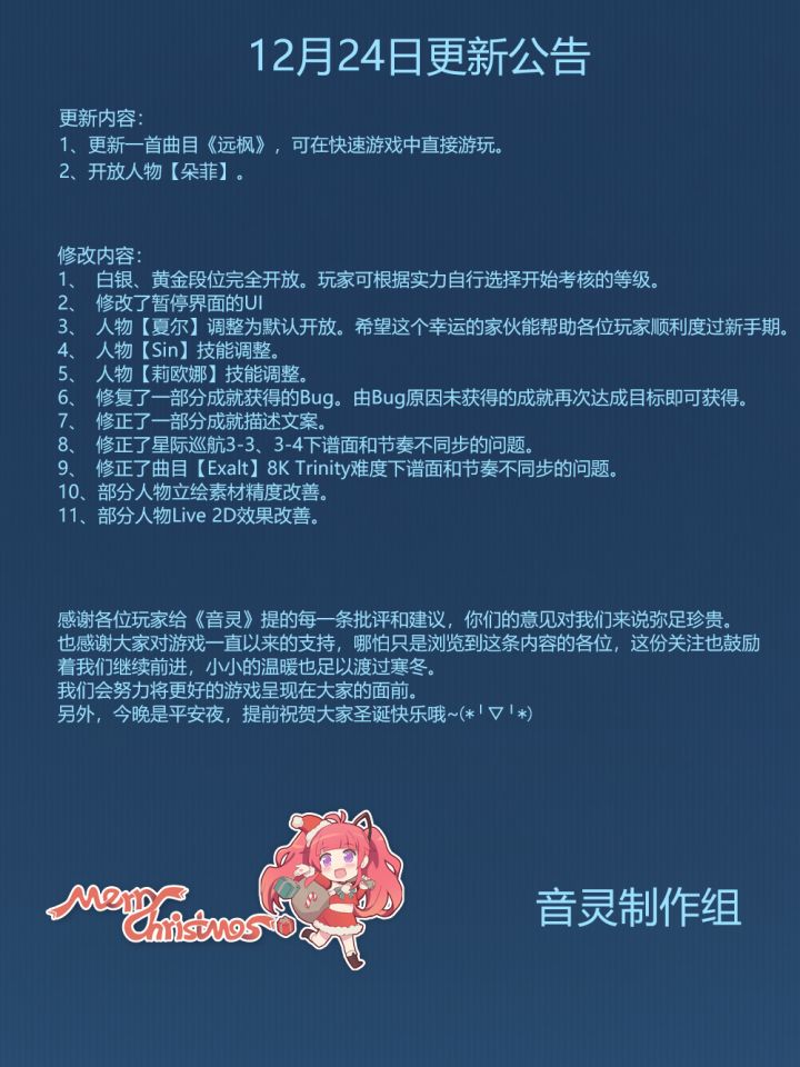 感谢各位玩家给《音灵》的每一条批评和建议。我们会努力将更好的游戏呈现在大家的面前。本次也尝试修复了一些玩家遇到的卡在登录界面的情况,可下载更新文件后尝试重新登录游戏。最后,今晚是平安夜,祝大家圣诞快乐~