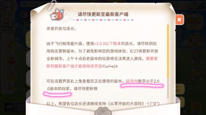 亲爱的各位店长大人:由于飞船性能升级,使用v2.0.0以下版本的店长,请尽快到应用商店更新版本,为了避免影响您的游戏体验,8月27日将更新开放全新城市,上午十点后老版本的玩家将无法再进入游戏,需要更新最新客户端才能继续开店,如更新遇到问题,请联系客服QQ:3575445285、2384952096