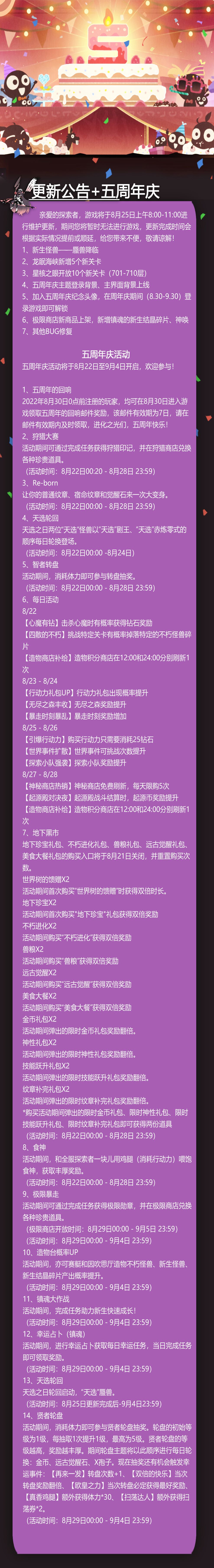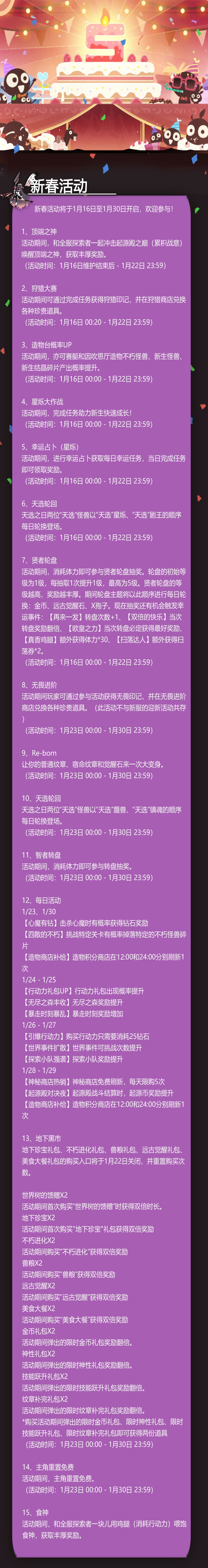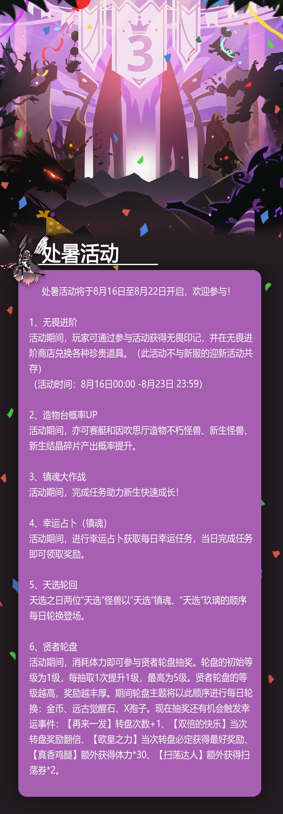 更新时间:12月7日上午08:00-12:00 更新形式:停服维护 更新内容: 1、「狩猎大赛」活动上线 活动期间可通过完成任务获得狩猎印记,并在狩猎商店兑换各种物品,首次活动时间为12月14日-12月20日。 2、造物积分商店迎来火神、赤虹、魅妆 每次刷新商店将有更大几率遇到心仪的新生怪兽。 3、星核之眼开放25个新关卡(651-675层) 4、幸运占卜活动体验优化,提高了部分奖励较好的任务出现