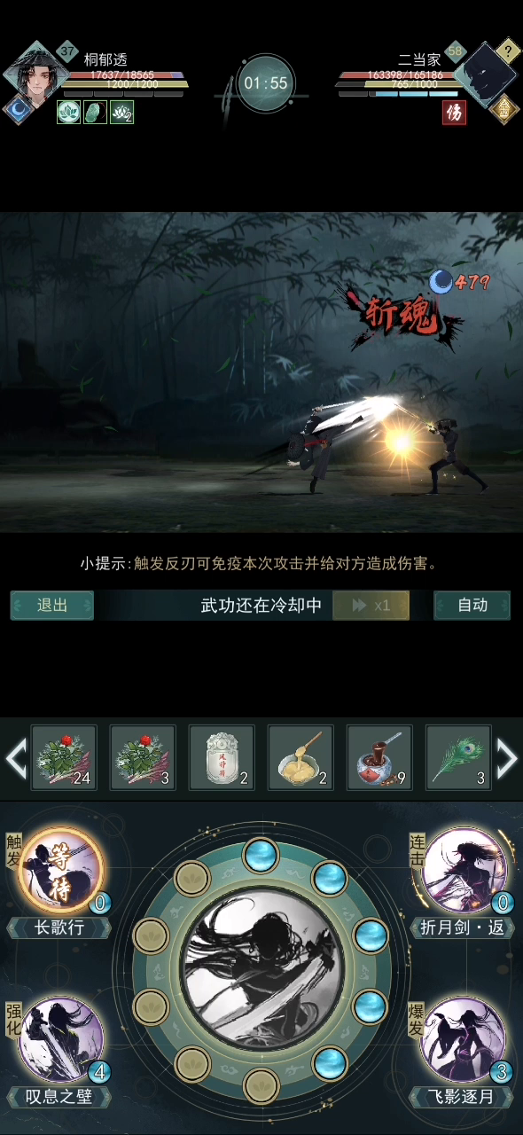 弱水剑魂的攻击机制是 剑魂强化视为一次攻击(虽然没伤害 视为一次攻击 可以附带debuff) 剑魂强化后效果(比如道剑破定和弱水六连)视为一次攻击,这个可以用疾风骤雨测试出来。 弱水剑魂被反刃有2种情况 第一种情况 剑魂没被反(剑魂强化技能没伤害但是算一次攻击并且可以附带debuff 可以被反刃)所以消耗了100层若水buff 但是后续的六连被反刃 所以没有伤害 跳过回合 第二种情况 剑魂强化时被