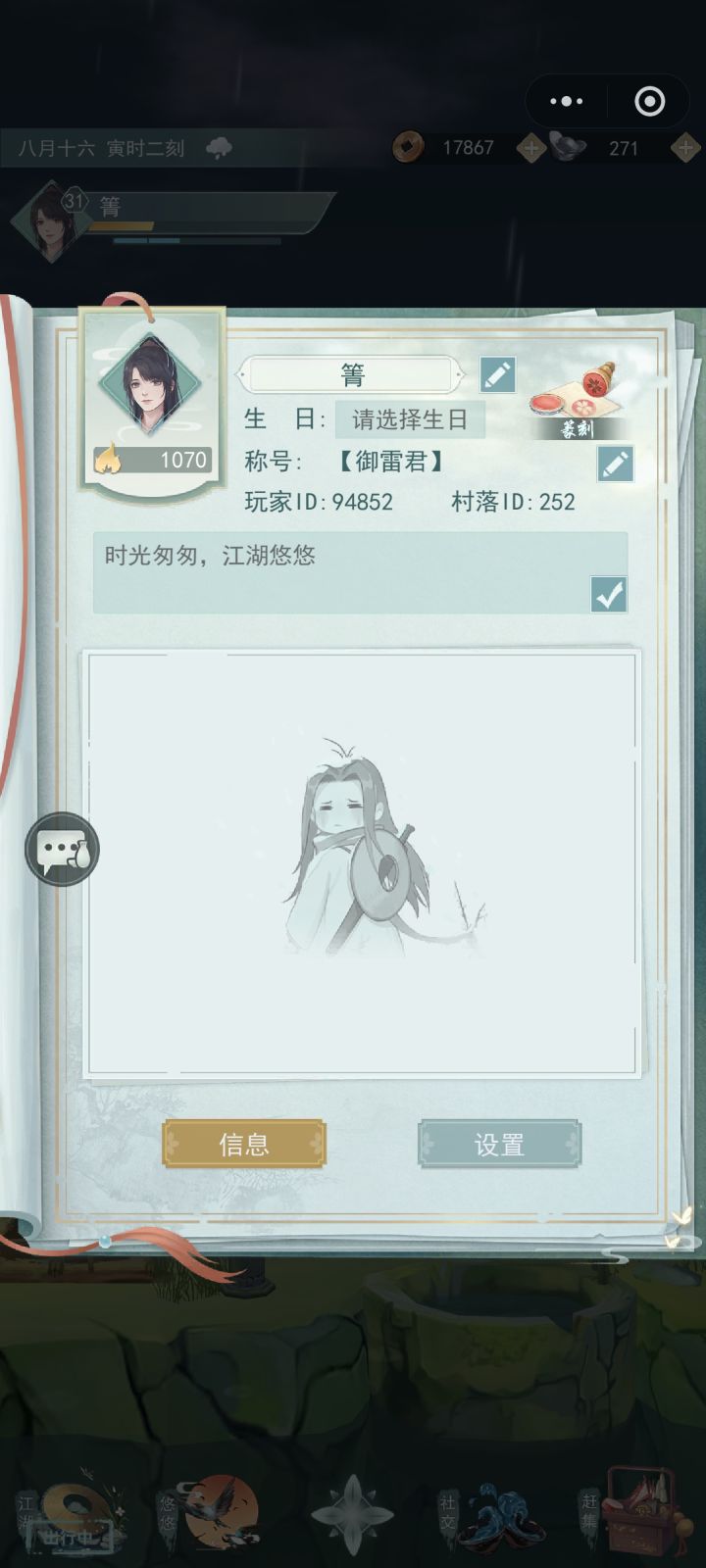 大学期间在找游戏时偶然发现江湖悠悠的二测,抱着试试看的心态下载打开,结果沉迷到无法自拔,定闹钟大半夜收菜。然后没多久测试结束,左等右等等到了三测也是匆匆结束了测试,直到21年终于听到了那个振奋人心的消息公测了要上线了。公测开始虽然改动很多,特别是侠道没有了二测时候的感觉但依然是喜欢的江湖悠悠。公测时候加入了很多社交元素,我也在游玩中加入了村落,七杰,认识了很多朋友。中午大家定闹钟去宴会,做菜喝酒都