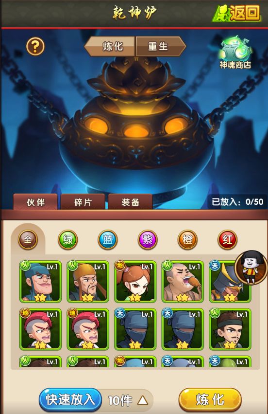 1. 乾坤炉可以炼化回收伙伴,装备,也可以进行伙伴,装备,宝物,珍兽重生。2. 炼化:主要作为回收未培养的伙伴和装备。1) 伙伴/伙伴碎片炼化:未培养过的伙伴,可以炼化成为神魂,神魂可以在神魂商店兑换伙伴。2) 装备炼化:未培养过的装备,可以炼化成为百炼石和银币。百炼石可以在杂货店购买高级装备。3. 重生:主要作用回收已培养过的伙伴,装备,宝物,珍兽1) 伙伴重生:培养过的伙伴可以通过重