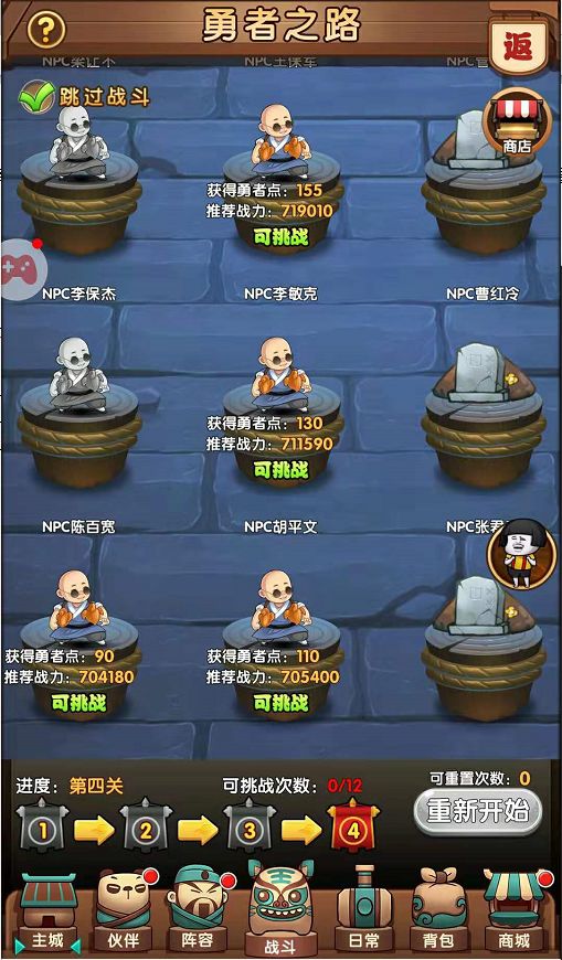 这次给大家介绍一下勇者之路这个系统的一个玩法,首先我们进入到游戏找到勇者之路的图标。点开进去发现还真的是吃鸡的(小和尚挂满烧鸡)。其实这个系统的玩法很简单,无非就是吃鸡,不是,攻击那个小和尚击败获取那个勇者点数。但是这里也是存在一个技巧的,不是随便攻击的;因为你挑战的过程发现那些可挑战的小胖子都是弱鸡,随便几下就打败了。等你越打越觉得纳闷的时候,你终于发现了套路的所在了,没错,打完上面还有一