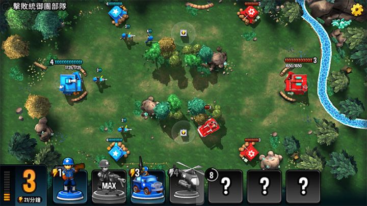 【简单】获胜条件:击败统御团部队出战阵容:第一章的剧情都在森林地图中发生。森林图的主要特点是笔直的三条分路,两个能量箱子会定期在两条边路刷新。在开局能量6点的情况下,如果这6点分配得当是有机会同时控下两个能量箱子的。一旦控下两个箱子,我们在能量上的领先足以让我们轻易赢下一局。本关开局时对方一般会刷出一些普通士兵来和我们抢能量箱子。可以选择部署重机枪于两个边路保护自己的普通士兵:恰好让重