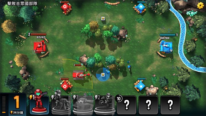 【简单】获胜条件:击败统御团部队出战阵容:第一章的剧情都在森林地图中发生。森林图的主要特点是笔直的三条分路,两个能量箱子会定期在两条边路刷新。在开局能量6点的情况下,如果这6点分配得当是有机会同时控下两个能量箱子的。一旦控下两个箱子,我们在能量上的领先足以让我们轻易赢下一局。本关开局时对方一般会刷出一些普通士兵来和我们抢能量箱子。可以选择部署重机枪于两个边路保护自己的普通士兵:恰好让重