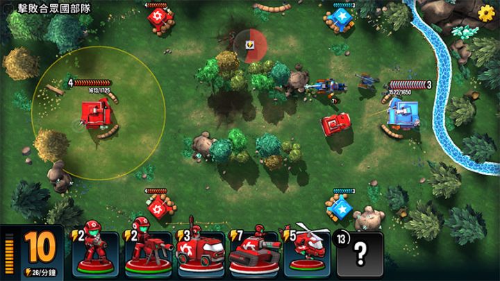 【简单】获胜条件:击败统御团部队出战阵容:第一章的剧情都在森林地图中发生。森林图的主要特点是笔直的三条分路,两个能量箱子会定期在两条边路刷新。在开局能量6点的情况下,如果这6点分配得当是有机会同时控下两个能量箱子的。一旦控下两个箱子,我们在能量上的领先足以让我们轻易赢下一局。本关开局时对方一般会刷出一些普通士兵来和我们抢能量箱子。可以选择部署重机枪于两个边路保护自己的普通士兵:恰好让重