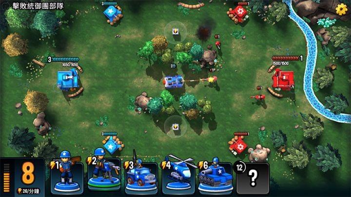 【简单】获胜条件:击败统御团军队出战阵容:本关和简单模式1-1差别不大,对手的阵容构成主要是机枪卡车、重机枪和普通士兵,在开局一段时间后会刷新坦克。开局时会部署机枪手或直接机枪卡车:第一关我们已经知道了在同等级的情况下机枪手是无力对抗机枪卡车的,所以我们依旧后手部署。面对机枪卡车我们可以直接放出一辆6点资源的坦克。如果是机枪手开局,我们可以先部署机枪卡车来清理机枪手。仅仅一辆坦克对于能量