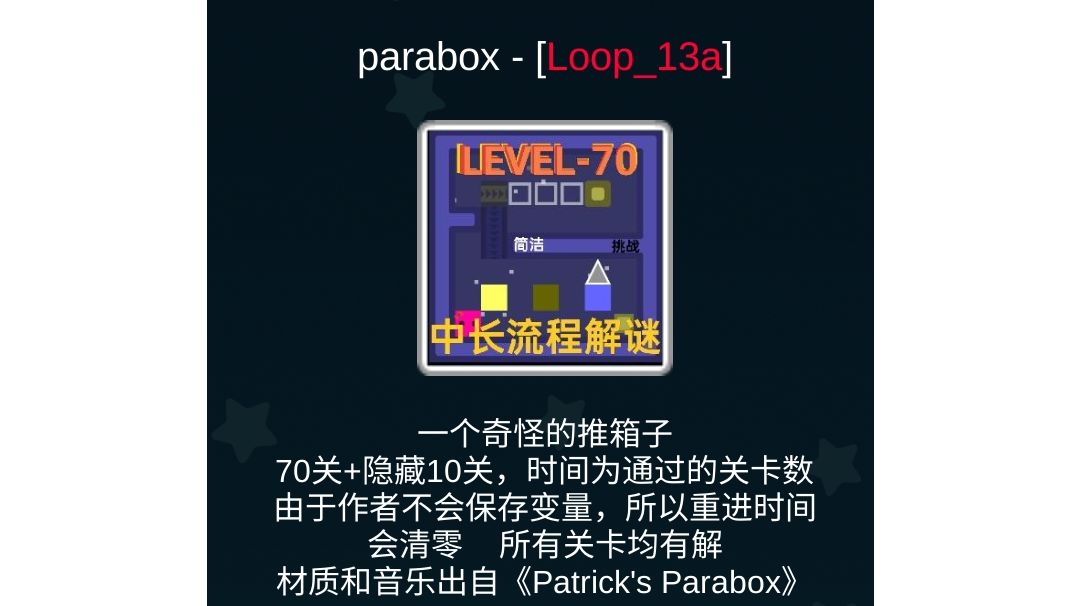 大家好,我是Loop_13a,封面是我在iwbtc自制的一张地图,parabox。本人非常喜欢玩各种解谜游戏,特别是一些有趣的推箱子,像baba is you,Maxwell's puzzling demon,还有Patrick's parabox。这张图也是基于我最喜欢的Patrick's parabox来制作的。(但是其实游戏内容和它没有一点相似之处,只是因为本人美术不好,直接用它的材质和音乐