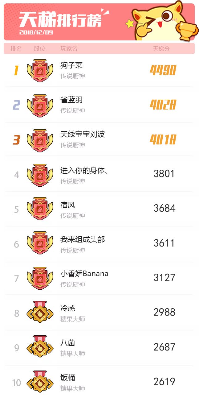 截止到今天中午,梦幻岛迎来了首位传说厨神!除此以外众多玩家也冲击到了糖果大师段位,各位大佬的效率果然让人望尘莫及Orz。让我们一起来看看昨天尼克的加入让TOP10有没有大换血呢? 虽然有众多新名字的出现,然而昨天稳居第一的”狗子莱“玩家今天依然雄踞榜首,路人局被大佬摩擦的小编瑟瑟发抖ing(哭哭)。 那么各位岛民今天也要努力保卫梦幻岛,争取早日拿到糖果大师的无上荣誉哦!