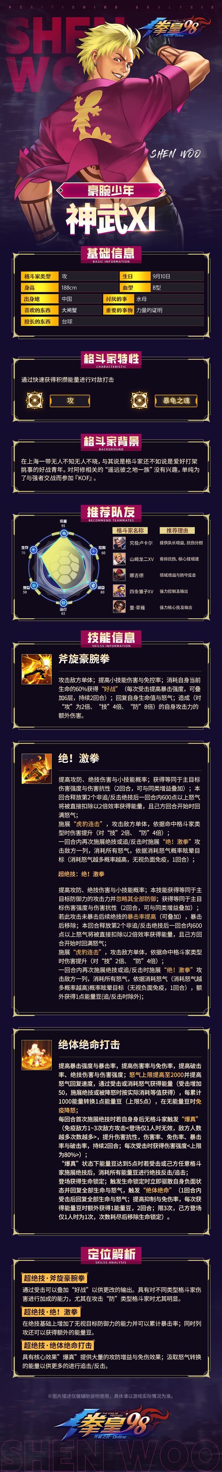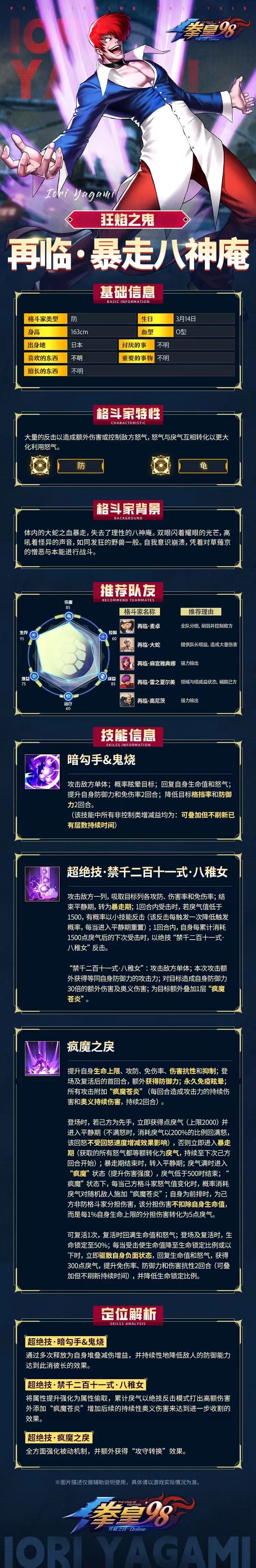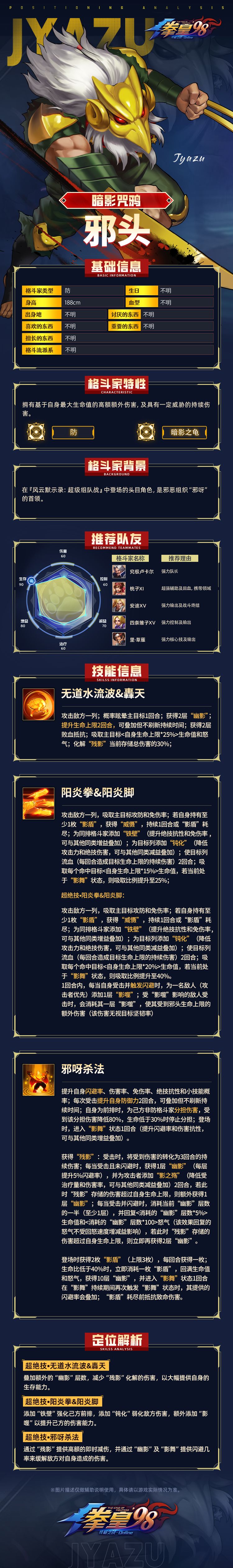 当下阵容拳粉们玩的怎么样了呢?里·草薙有没有达到你们的预期呢?阵容多了一名核心技格斗家势必会对当下阵容局势造成影响,但是这个月的邪头会不会给阵容更添一抹亮色呢?接下来小舞就带大家来了解一下这次暗影咒鸦-邪头的技能吧!