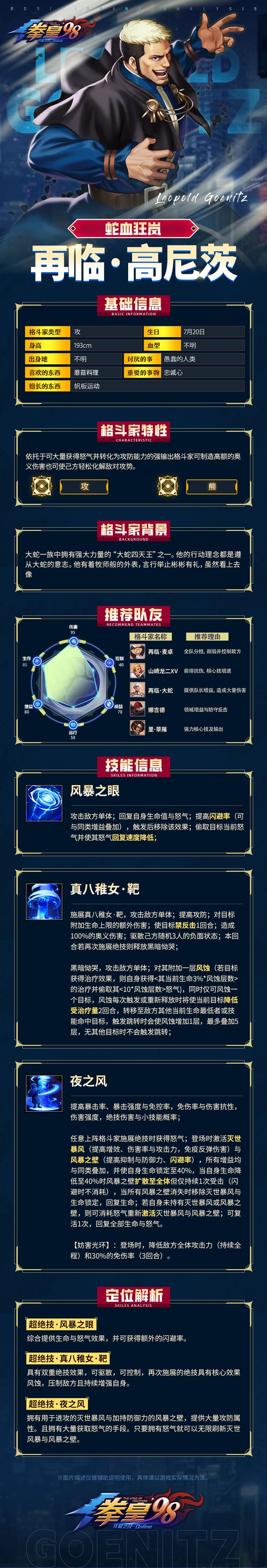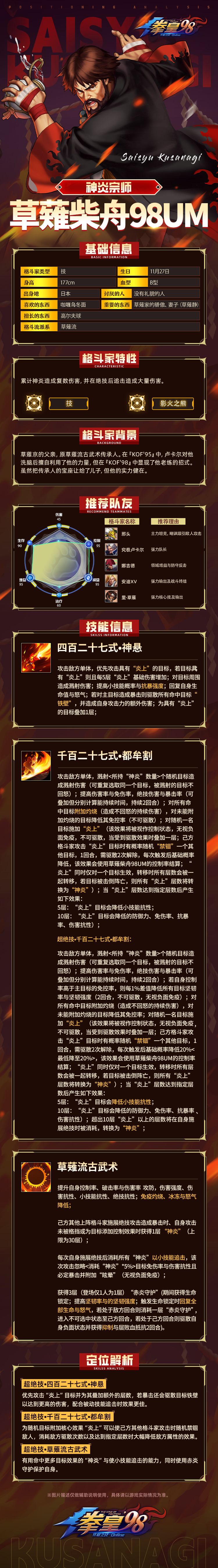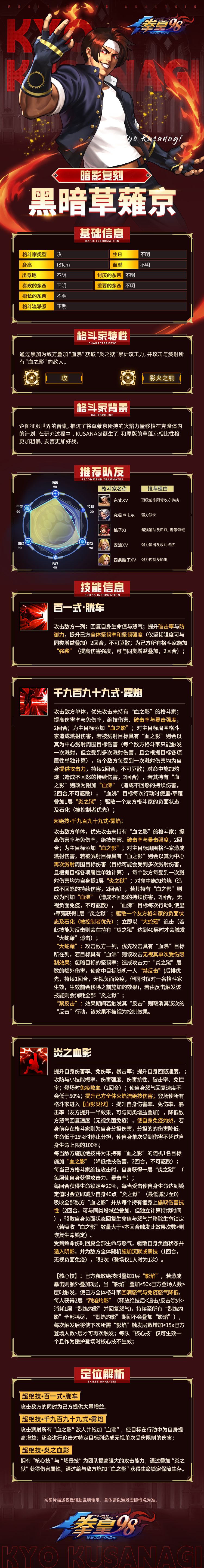 当下阵容拳粉们玩的怎么样了呢?吉斯的无限恶念流有没有达到你们的预期呢?阵容多了一名强势防格斗家势必会对当下阵容局势造成影响,但是这个月的新格斗家会不会给当下阵容造成影响呢?接下来小舞就带大家来了解一下这位复刻草薙京的克隆人-里·草薙的技能吧!