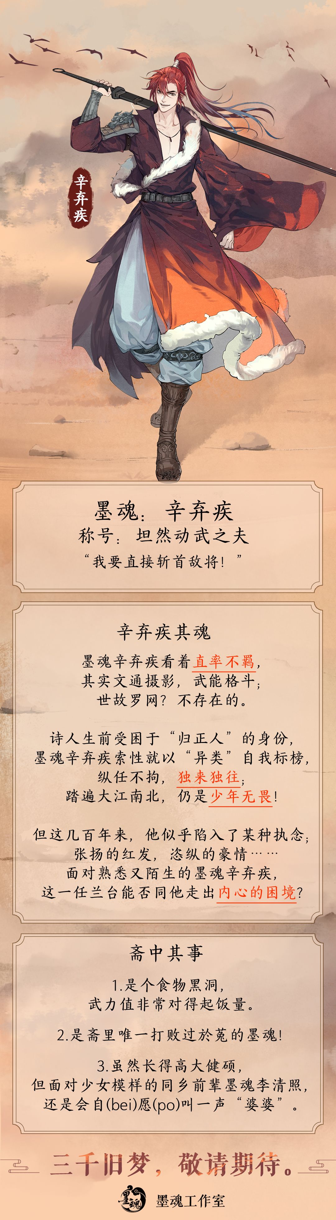 墨魂辛弃疾文武双全,纵任不拘,最是知世故而不世故的少年心性。 看过他的魂设,诸位兰台或许仍有疑惑之处,还请留待游戏中,由诸君亲自去往溯缘里寻一个答案。