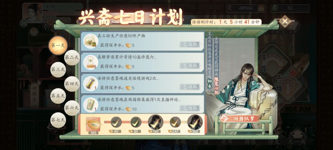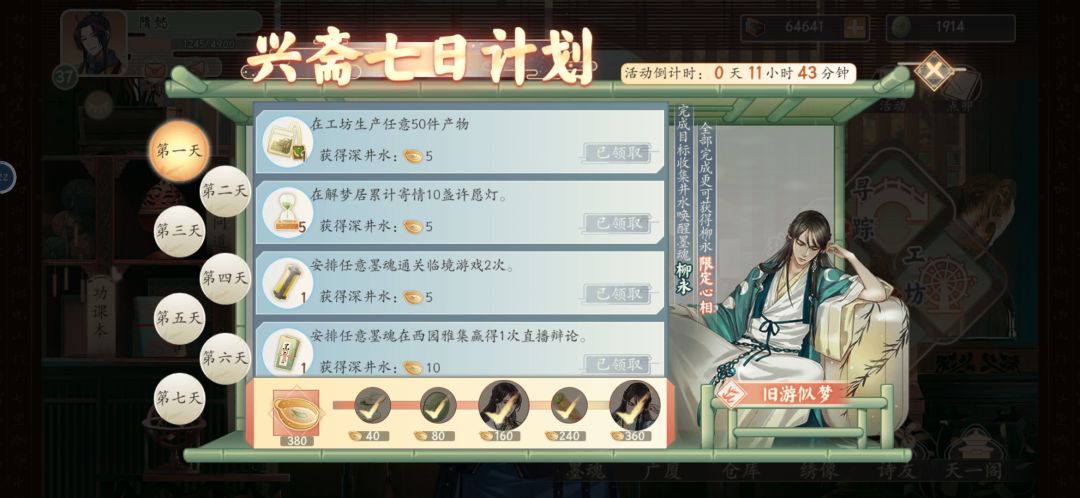 虽然也是是萌新,但是根据我玩小游戏的经验,习惯性一进游戏就把所有功能窗口都浏览一遍,然后慢慢了解各种数值是通过什么提升的。 然后发现了非常传统,我称之为入坑头七(不是)的励精图治,一般我玩游戏最肝也就这七天吧,我很佛的其实,可以看到虽然得到了柳永的心相但没做完全部任务。 下面附上的是所有任务的截图(每天八个任务一共七天) 第一天 共计50深井水 第二天 共计45深井水 第三天 共计50深井水 第四
