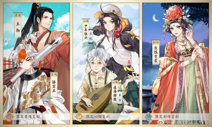活动概要:活动期间,可在限时内寻得【墨魂王勃】,并且寻踪概率提升为其他甲部墨魂的2倍;可在限时内寻得【墨魂骆宾王】,并且寻踪概率提升为其他乙部墨魂的2倍。注:墨魂王勃和骆宾王仅可在本卡池期间寻得,常规卡池无法寻得。