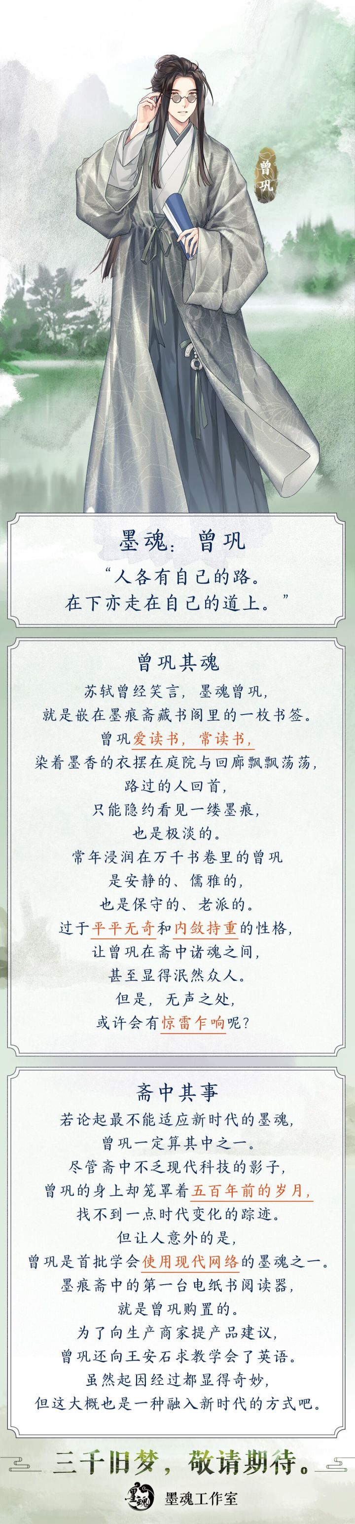 当科考、为官、生计这样的压力轻飘飘自肩头散去,若要问如今的墨魂曾巩喜欢什么,仍是读书。曾巩读书,没有任何目的。他只是翻开书,享受文墨的香气萦绕,观赏横撇竖折里的气韵。温和儒雅、喜爱阅读的墨魂曾巩归斋:“在下南丰曾巩,曾子固,幸会兰台先生。”