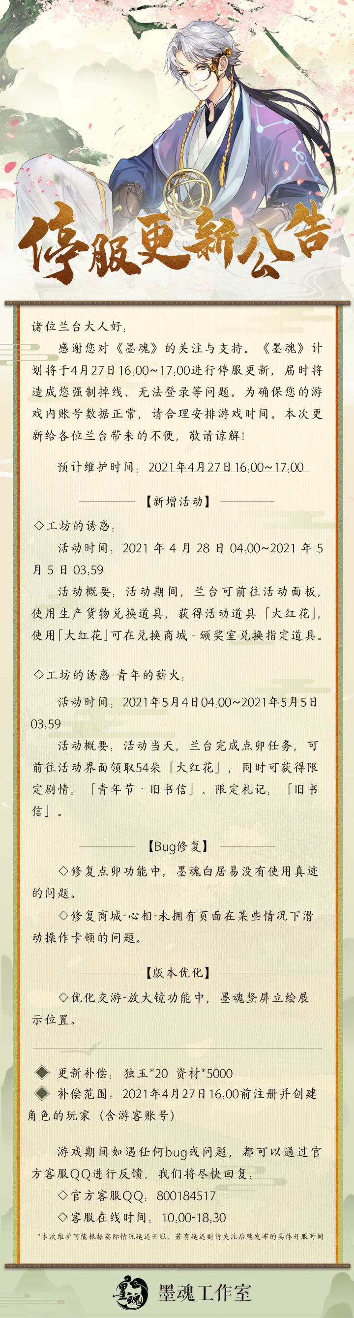 诸位兰台大人好:感谢您对《墨魂》的关注与支持。《墨魂》计划将于4月27日16:00~17:00进行停服更新,届时将造成您强制掉线、无法登录等问题。为确保您的游戏内账号数据正常,请合理安排游戏时间。本次更新给各位兰台带来的不便,敬请谅解!预计维护时间:2021年4月27日16:00~17:00维护内容:【新增活动】◇工坊的诱惑:活动时间:2021年4月28日04:00~2021年5月5日