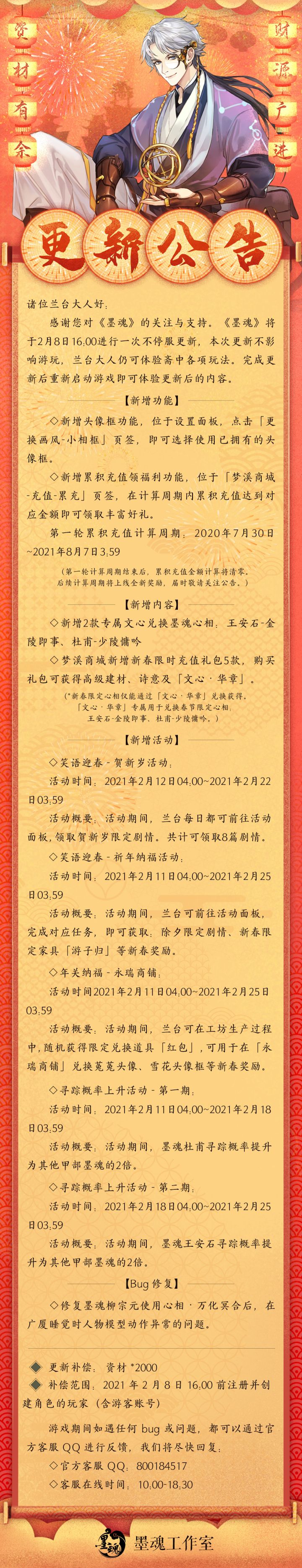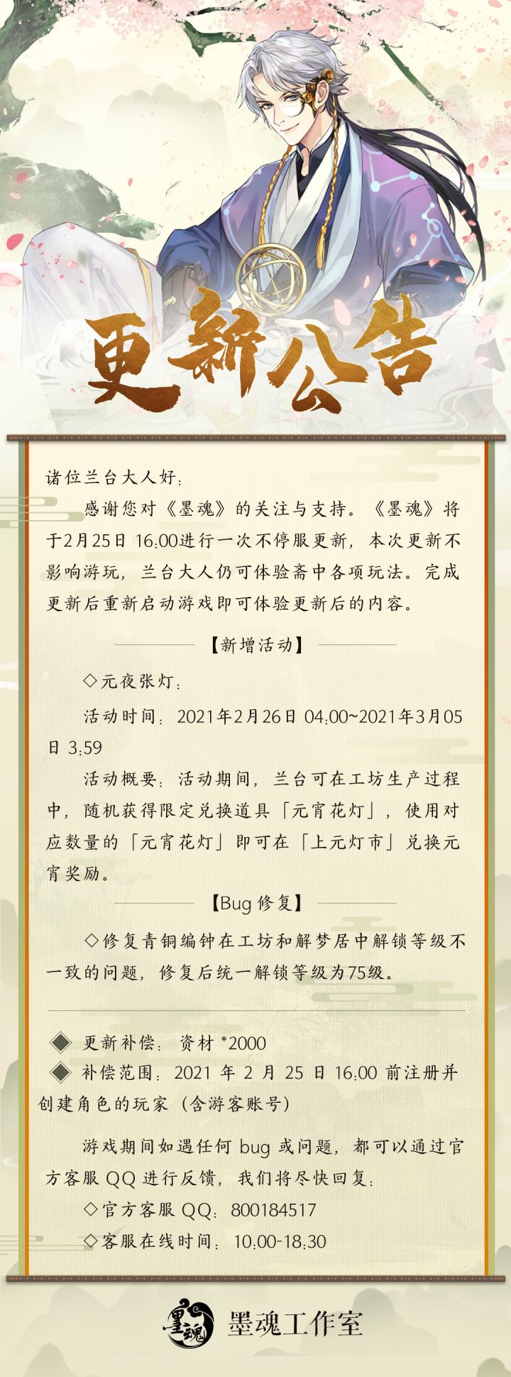 诸位兰台大人好:感谢您对《墨魂》的关注与支持。《墨魂》将于2月25日 16:00进行一次不停服更新,本次更新不影响游玩,兰台大人仍可体验斋中各项玩法。完成更新后重新启动游戏即可体验更新后的内容。更新内容:【新增活动】元夜张灯:活动时间:2021年2月26日 04:00~2021年3月05日 3:59活动概要:活动期间,兰台可在工坊生产过程中,随机获得限定兑换道具「元宵花灯」,使用对应数