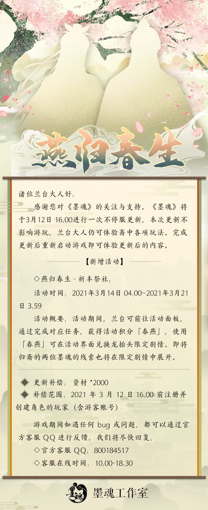 诸位兰台大人好:感谢您对《墨魂》的关注与支持。《墨魂》将于3月12日 16:00进行一次不停服更新,本次更新不影响游玩,兰台大人仍可体验斋中各项玩法。完成更新后重新启动游戏即可体验更新后的内容。更新内容:【新增活动】◇燕归春生-祈丰祭社:活动时间:2021年3月14日 04:00~2021年3月21日 3:59活动概要:活动期间,兰台可前往活动面板,通过完成对应任务,获得活动积分「春燕