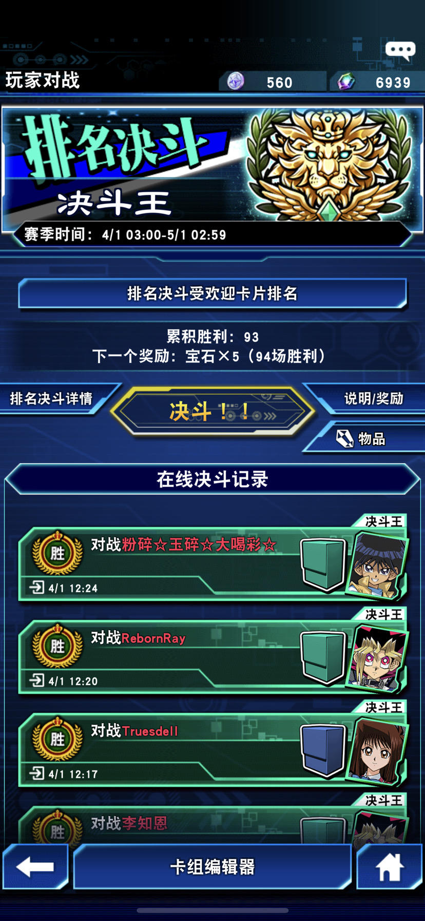 商店可以兑换的东西:卡套、卡垫、超凡交换券、稀有交换券×2、镜碎交换券、宝石50×3 需要卓越宝玉25、50、75、25×2、50、12×3 赢3宝玉,输1宝玉。全部换完需286宝玉 卡套、卡垫、镜碎、宝石。优先换这4个。 大乱斗后续。8月16日。 大乱斗不成文潜规则:先手点投降。先手不点投降享受后手烧绳,喜欢磨时间就一起磨。 一小时100宝玉左右,期间跟四五个人磨了时间。全部刷完大概3小时。 左