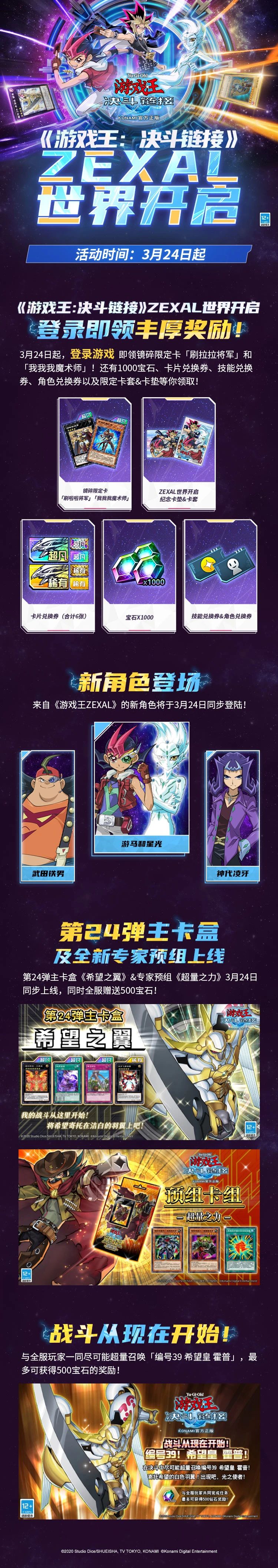 新世界、卡盒、预组,3月24日上线。 初始人物:游马、神代凌牙、铁男 卡盒卡:霍普、拟声连携、拟声乌托邦、我我我妹妹、断钢、九神龙、签约、保镖、黑妹、幻想之黑魔术师、弩弓部队 预组卡:我我我枪手、番长、手套 登陆奖励:超凡梦想券、稀有梦想券、1000宝石、卡套卡垫、镜碎 技能调整,23日上线。 神鹰的狩猎场:削弱。免费场地变成要用1手牌交换。好处是如果是后手,场地不会被对面先手炸了。 恶魔共鸣:加