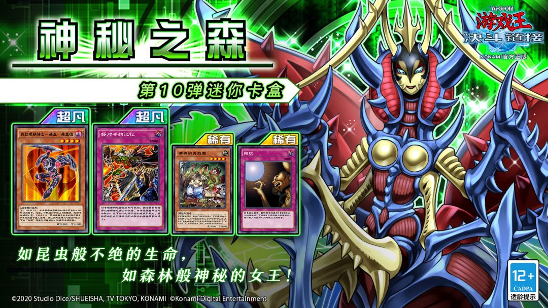 此卡盒收录了「虫惑魔」系列,强化「真红眼」系列和昆虫族卡组,还收录了可以广泛应用于各个卡组的「陷坑」和「好对手的记忆」!全卡表将于明日公开。 更多关于「真红眼」新卡情报以及「真红眼」卡组的使用方法可以前往【游戏王决斗链接攻略站】小程序中查看。 「终极变态昆虫女王」 当场上有其他昆虫族怪兽存在的场合,此卡可以保护所有的昆虫族怪兽不会成为对手的效果对象,不会被对手的效果破坏! 双方回合结束阶段,还可以
