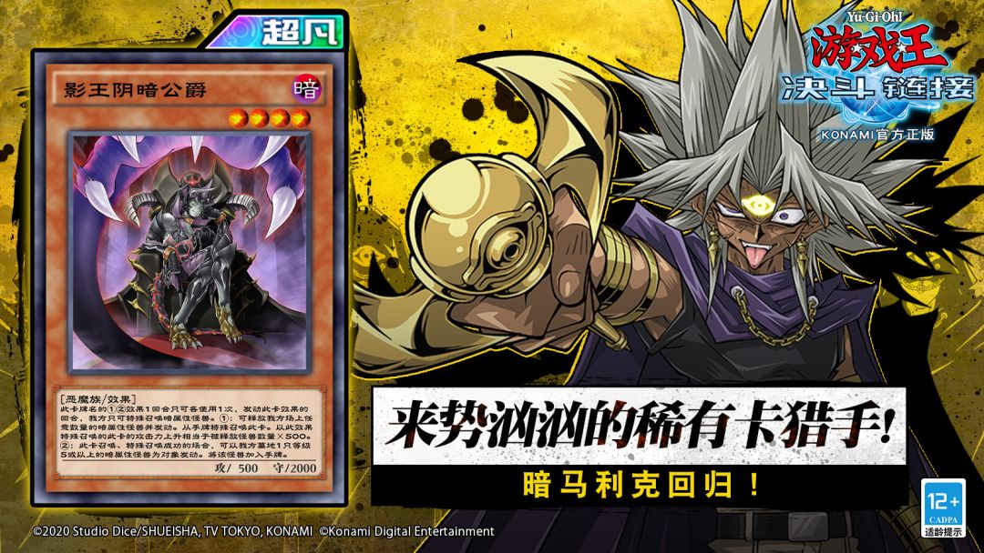 12月23日开始,来势汹汹的稀有卡猎手将会登陆决斗世界! 活动期间,战胜决斗世界中的决斗者,收集活动道具,就可以向暗马利克发起挑战! 通过决斗获得积分赢取超凡卡「影王阴暗公爵」、稀有卡「太阳神的使徒」以及宝石,金币等奖励!赢得决斗增加积分,还可解锁暗马利克的角色使用权! 「影王阴暗公爵」 此卡可以解放我方场上任意数量的暗属性怪兽特殊召唤登场,同时提升自己的攻击力! 召唤·特殊召唤成功登场的场合,还