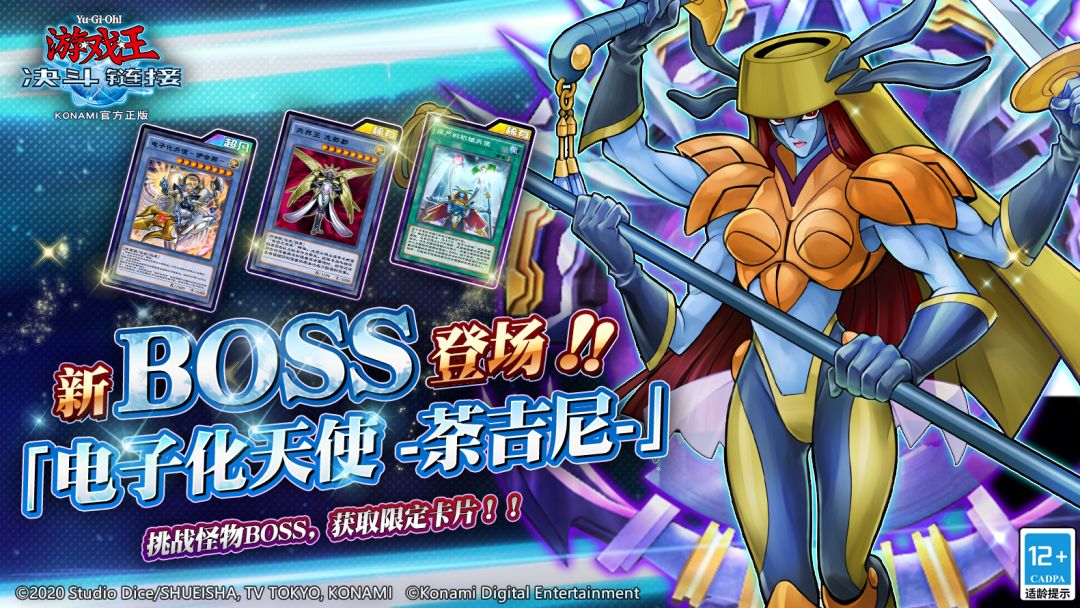 【怪物之门】新BOSS即将登场! #游戏王决斗链接# 【怪物之门】新BOSS即将登场! 2月16日上午11:00起“电子化天使-荼吉尼-”将出现于怪物之门!天上院 明日香的王牌怪兽登场! 擅长仪式召唤的“电子化天使-荼吉尼-”拥有辅以仪式展开的技能,最强“电子化天使”将会降临! 挑战“电子化天使-荼吉尼-”将有机会获得超凡卡「电子化天使-伊舍那-」稀有卡「庄严的机械天使」「天界王 志那都」等奖励