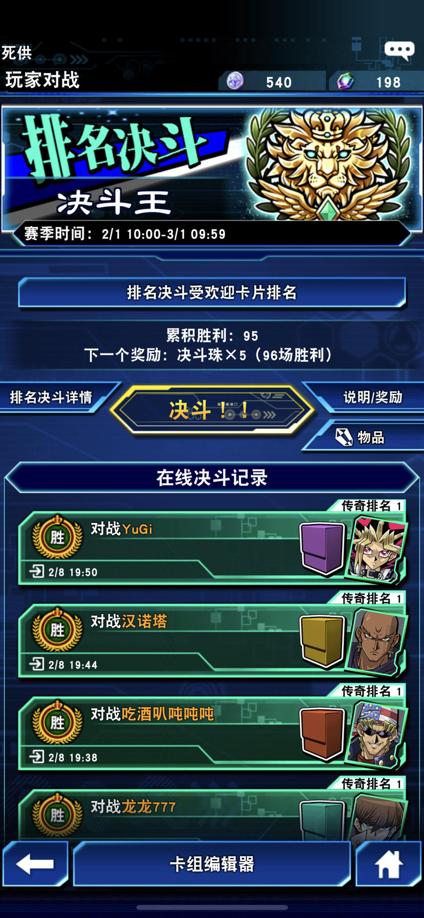 用的神鹰女郎卡组,零氪,只肝了舞和社长,不抽包不肝也可以高速上传,并且只需要抽大卡池和万用卡,我现在还剩快6k的钻。不过如果想上王还是需要镜壁和栗神龙(镜壁链接),实际之前低配150胜打上王晋级赛,然后起手爆抽两个万华镜加三姐妹,对面还胡了,之后神鹰纳祭魔开始俯冲传1乱玩。抽了镜壁直接魂起来一波连胜上王(共计260场,,60胜率上的)。本来打算组出来魂一会,实际在现在的环境里面也还可以,现在国服的