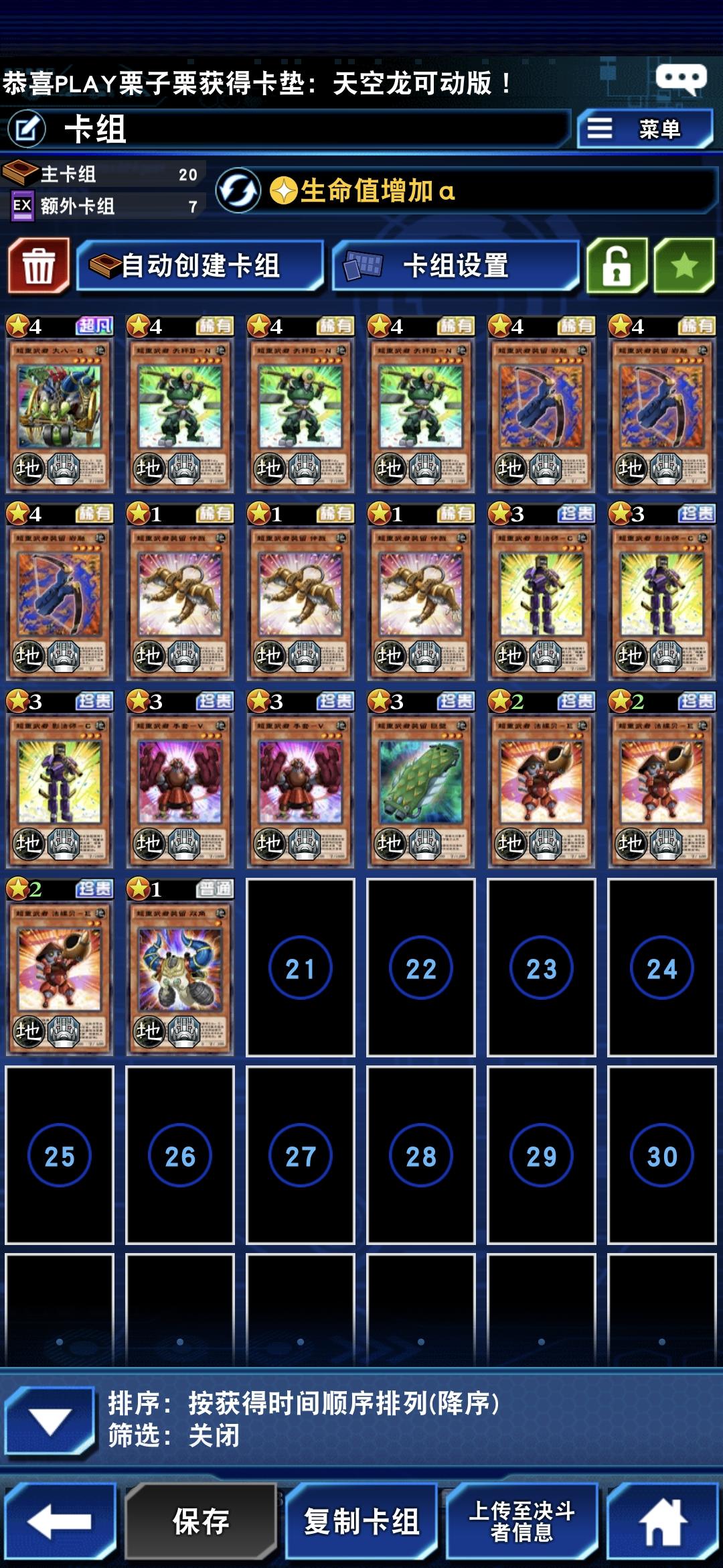 注意点。军队龙和滑翔机一定要堆到墓地,不能用融合之门除外。不然攻击力到不了5000,这套带城之内的最终一博,有特招融合仪式祭品。破魔士攻击力5400。卡组抽到最后一张打死对面,最后打完是7600分。还可以带两张继承之力,攻击力到一万。我没抽混沌战士所以没有加。