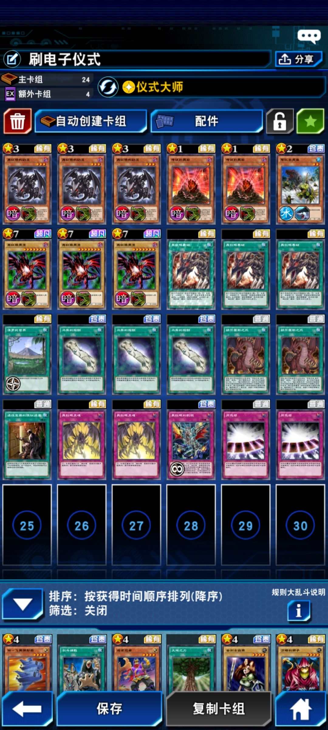 这个卡组需要城之内角色技能:真红眼轮盘 角色技能获得方法使用城之内召唤真红眼黑龙三次 需要抽的卡盒: 第29弹卡盒 雷霆降临 第10弹卡盒 神秘之森 购买3次真红眼预组(异度共鸣) 下面开始详细讲一下 第29弹卡盒 雷霆降临 需要抽的卡 其中钢炎龙0~2张都行(有就更好了),剩下的卡全部都只需要一张,新手先这样先。运气非全保底共9千钻石 牙这张卡以后有多余的钻石可以弄第2张。 第10弹卡盒