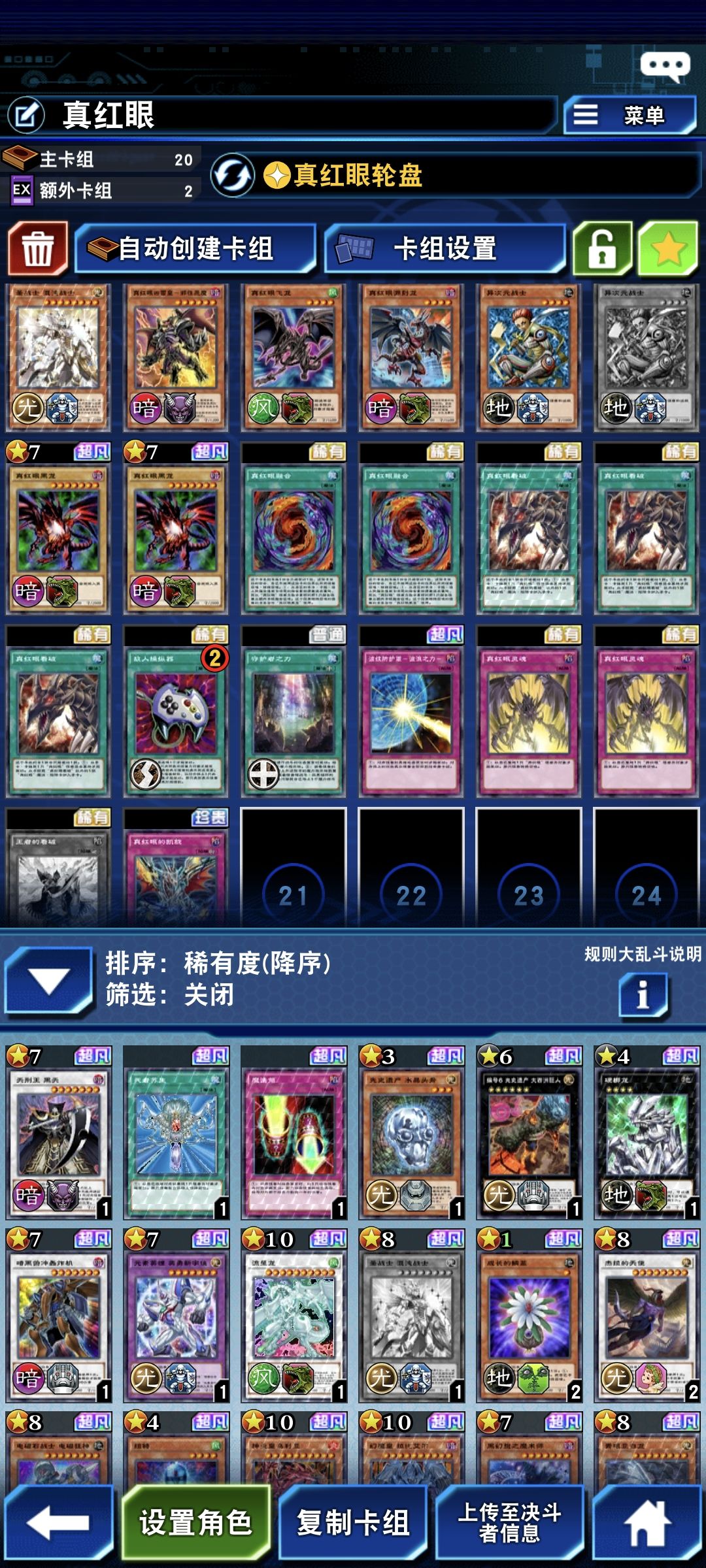 今日上的网,卡组先献上 这个角色用光头,可以回收2到3张灵魂,打同类可以一直上黑龙 洞悉排位75胜,用卷换三张 黑龙降临在怪物之门刷,很容易出,它的效果在送去墓地的下个回合可以除外拿到一张真红眼的魔法或陷阱 上面这三张配合使用很好 鸟可以拿到黑龙降临,在配合提升能量可以出奇效 这两张看自己,加在一起一共投入一到两张 镜子打白龙或者同类都可以出奇效,用在音速鸟身上也不错 王者的看破可加可不加,因为没