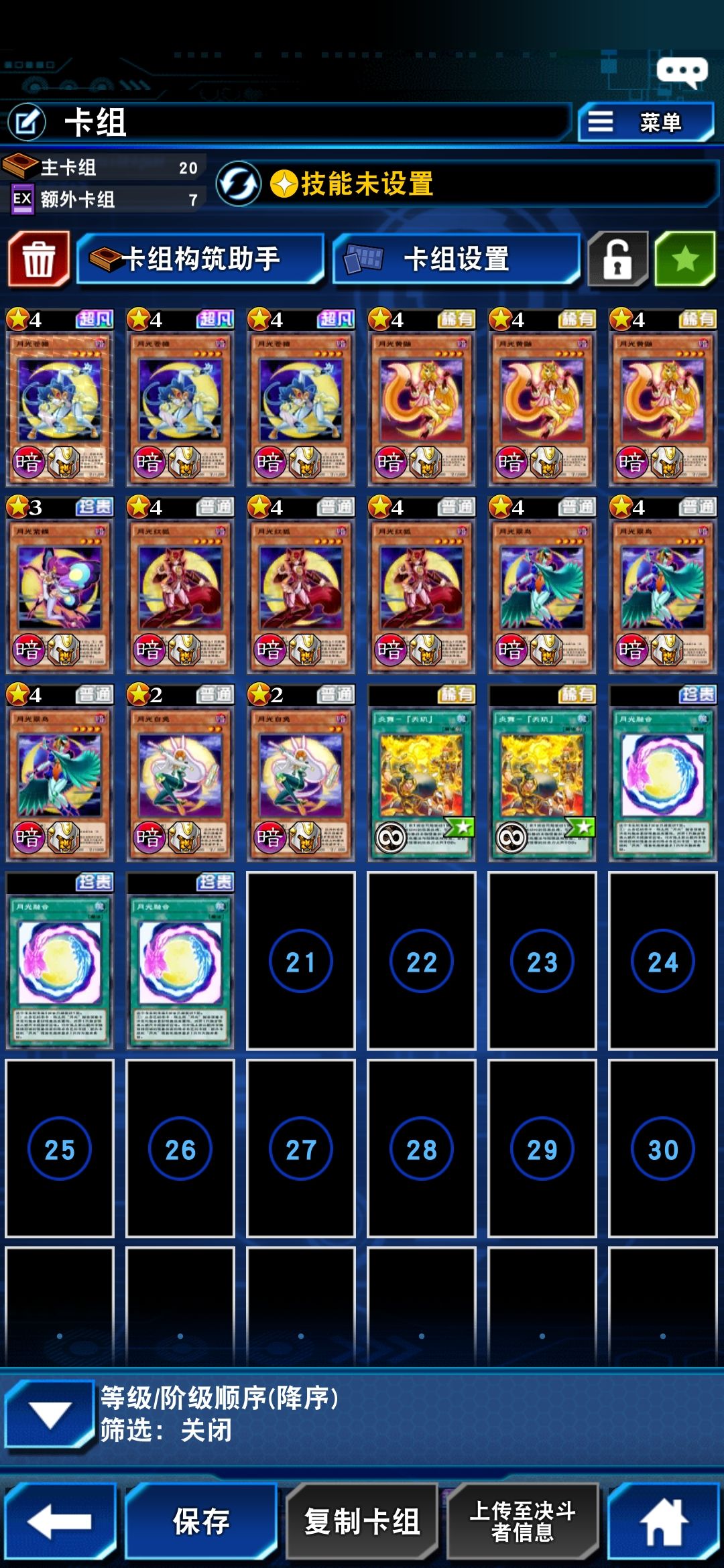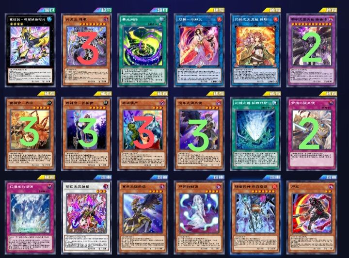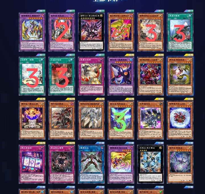 高贵的技能战士,先手站降雷皇,场地抽2。容易过到打断卡。我的构筑里带了超融合,面对战华,白龙,英雄等卡组,有奇效。另外,带了2个误捕,打战华,闪刀,内战,英雄等卡组都很不错。缺点是会卡自己检索。不过依靠技能换牌,是不受影响的。 能做效破抗性的水晶翼和战破抗性的本家8星,回合外二速炸。强度还是可以的。 本家破坏遗言很烦人,强度个人感觉中规中矩。 三国展开多种多样,终端一般能保底2个干扰。还是很强的,