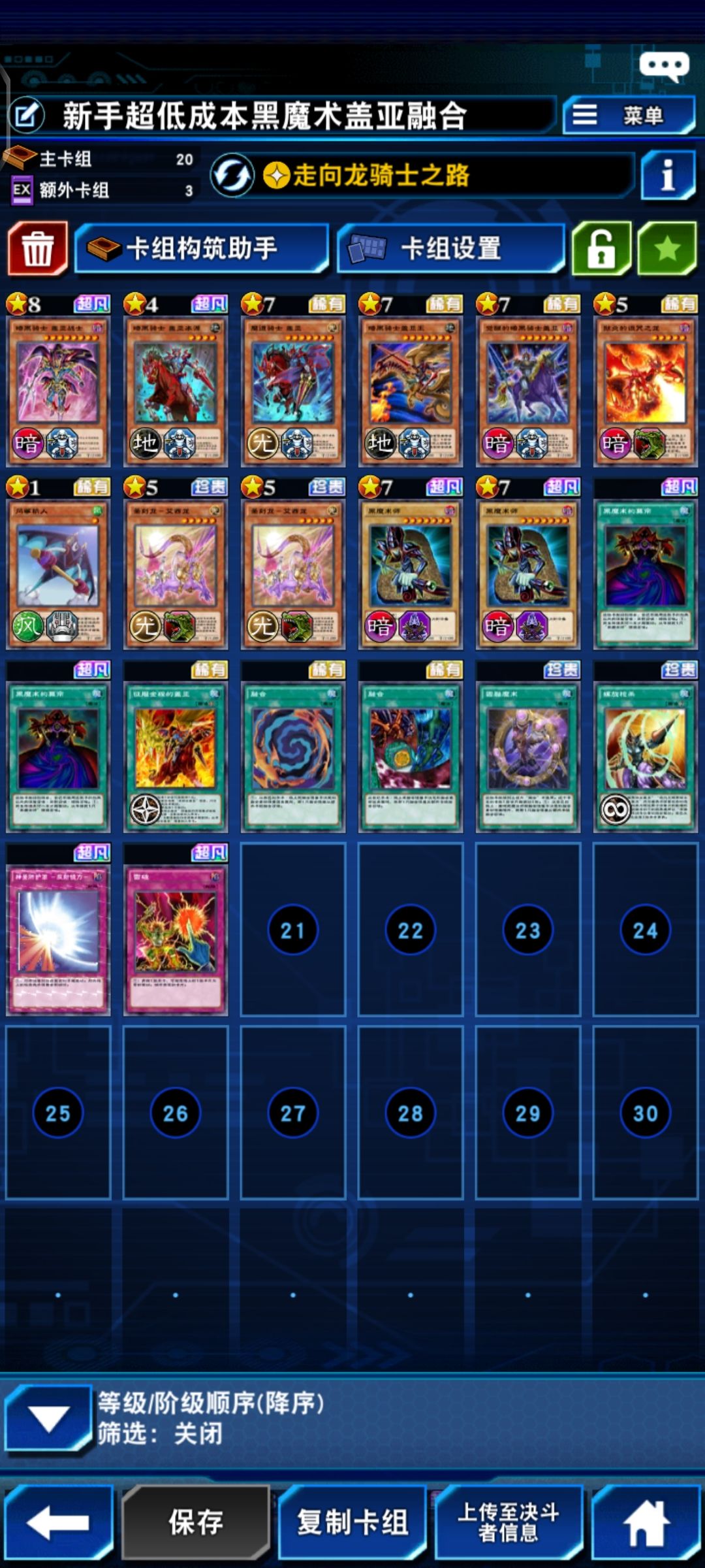 一开始用的这个构筑,用起来不太顺手 后来换了这个 从黄金~上王,图1卡组后手有炎舞玉衡打闪刀还行,我玩起来大多数1双龙、1吕布站场,少数情况卡手或做最大场。非本家额外就用过电光皇