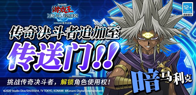 2月18日开始,活动登场的传奇决斗者——暗马利克将追加至传送门!在决斗世界内的“任务”中查看角色解锁任务。完成任务即可解锁暗马利克的人物使用权!暗马利克是守墓人一族的马利克·伊修达尔在经历“守墓仪式”后觉醒的黑暗人格。个性残忍而凶暴的他喜欢折磨对手,并有着常人难以理解的破坏冲动。使用可以在对方场上召唤的「熔岩魔神 岩浆石魔」,让对手在持续的痛苦中走向死亡。暗马利克的专属技能“黑暗游戏”可以根