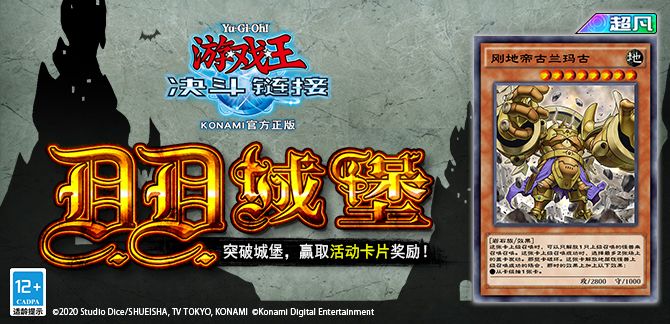 【D.D.城堡】中,决斗者们将和最多3只怪兽进行连续决斗,每战胜一轮怪兽就会立刻迎战第二轮怪兽,直至击败全部怪兽。击败拦路强敌,向城堡的最高层发起冲击!在决斗世界或排名决斗中进行决斗,可以获得“城堡钥匙”。消耗“城堡钥匙”就可以在【D.D.城堡】中向上层攀登,击败敌人即可获得活动道具参与抽奖。通过抽奖将有机会获得超凡卡「刚地帝古兰玛古」稀有卡「始源的帝王」、「真源的帝王」等卡以及宝石、金币等奖