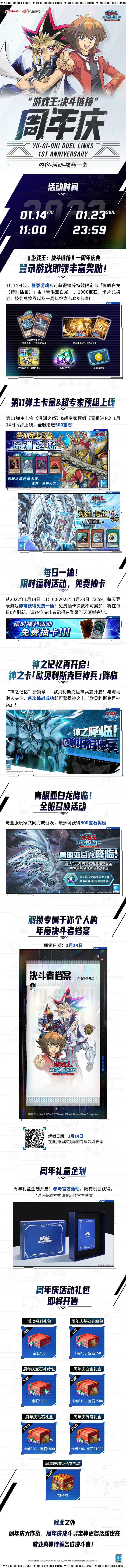 即将迎来一周年的庆典,让我们一起来了解本次周年庆活动的具体内容,共同欢庆一周年的到来吧!1月14日起,登录游戏即可获得镜碎「青眼白龙(特别插画)」和「青眼亚白龙」,一周年纪念卡套&卡垫,1000宝石和技能兑换券等奖励,累计登录还可获得超凡/稀有梦想卡交换券!第11弹 主卡盒《深渊之怒》,超专家预组《青眼进化》也将于1月14日同步上线!同时游戏内还将开启每日免费抽卡、神之记忆“欧贝利斯克巨神兵