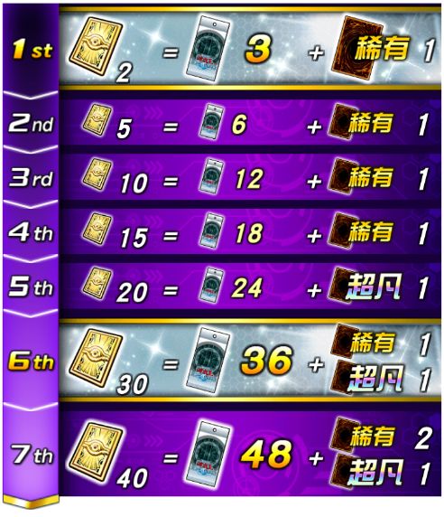 挑战胜利后可以赢取活动决斗者身上的积分道具,积累道具积分、挑战活动决斗者便可获得超凡卡「元素英雄 神·新宇侠」稀有卡「新宇侠的逆转」「新宇之怒」等活动限定卡片、宝石等奖励!