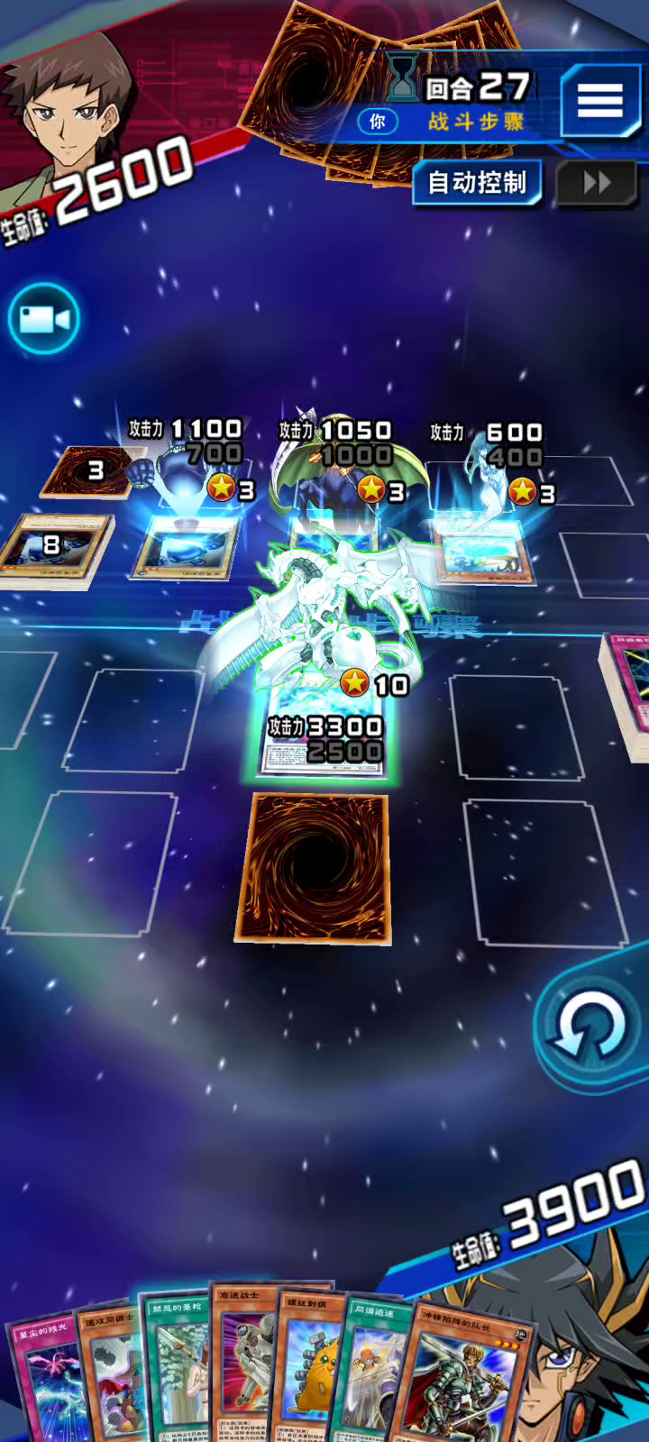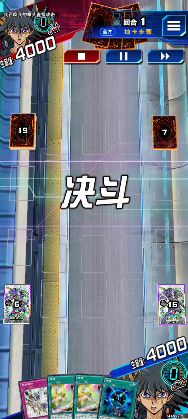 第一回合出攻3200不被效破废品战士,手牌还是4张。调律指定堆墓,游星本人