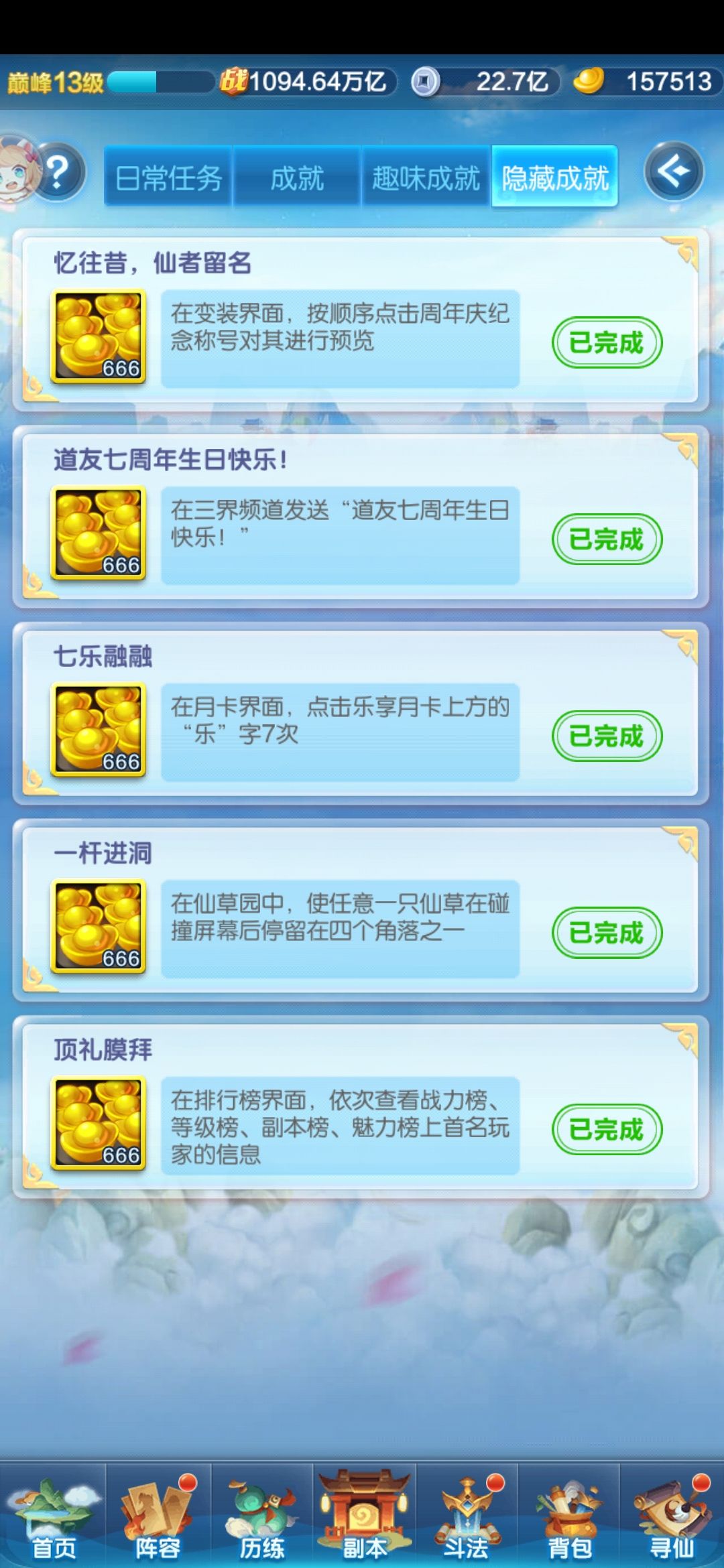 感谢各位大佬们的分享。这里对有两个成就说明一下,道友七周年快乐那个,要输入的喊话是:道友七周年生日快乐!9个字加感叹号。 一杆进洞这个,仙草界面,屏幕拉一边,然后随意拉一个仙草放在边缘就行。 称号那个在时装界面,称号那,往下拉,找到周年庆的称号,依次去点